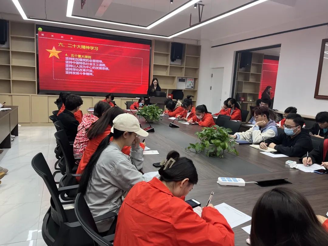 最后,胡钰琳同学带领着所有班长对党的二十大精神进行了学习。青年人要坚持党的全面领导,坚持中国特色社会主义道路,坚持以人民为中心的发展思想,坚持深化改革开放,坚持发扬斗争精神。广大青年尤其是班干部要做社会主义核心价值观的坚定信仰者,积极传播者,模范践行者,争做堪当民族复兴重任的时代新人,在实现中华民族伟大复兴的时代洪流中砥砺奋发,勇毅前进!