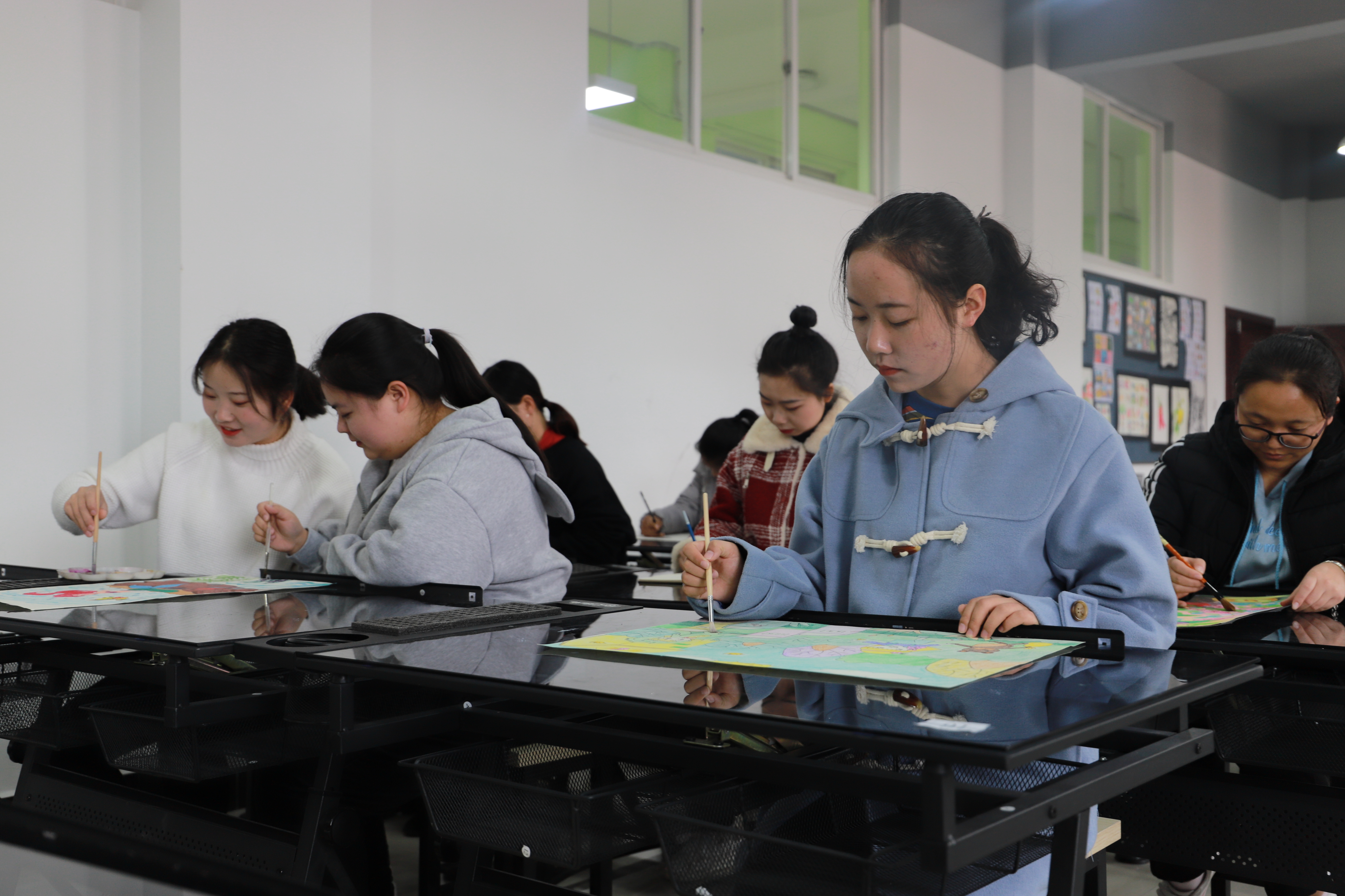 儿童美术教育实验室,共4间,总体使用面积为427平方米。主要配置有多功能美术展台,可倾斜调节升降绘图桌,石膏艺术几何及形体造型、写生教学设备等材料。实验室主要开设课程:《美术基础》、《儿童简笔画》。