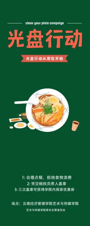 - 【创美艺传】光盘行动:抵制“舌尖上的浪费”光盘行动为进一步增强学生节约粮食、爱惜粮食的意识,反对浪费粮食现象,培养学生自觉养成珍惜粮食、珍惜劳动成果的好习惯。我校号召全校师生节约粮食,抵制“舌尖上的浪费”。因此,艺术与传媒学院青年志愿者协会以“节约粮食、反对浪费”为主题开展光盘行动。活动内容如下:1.学生持空碗到食堂二楼收餐点找活动负责人领取优惠券并盖章。2.完成三次盖章后可获得学院内部分商家优惠券。各商家优惠内容如下:川香干锅:每份减2元。喜之茶:奶茶减1元。昭通小肉串:烧烤20减2元。特色铜