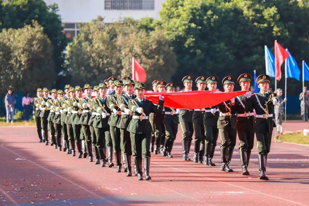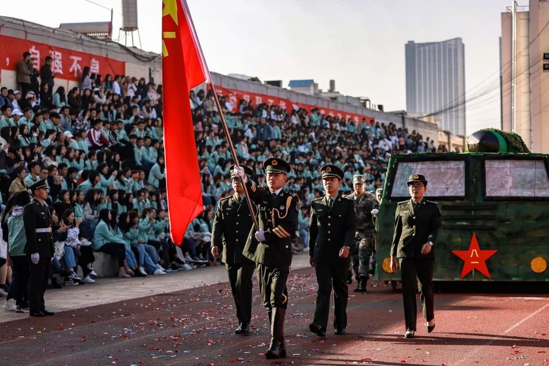 在庄严的国歌声中,国旗方队踏着矫健的步伐,高举鲜红的国旗、校旗、会旗,气宇轩昂。全体人员肃穆而立,共唱国歌。嘹亮乐声爱国心,激昂旋律中华情。