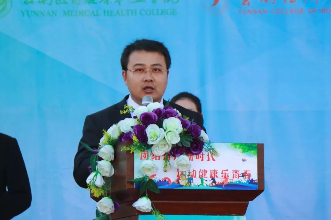 云南经济管理学院医学院党总支副书记高攀致开幕词。他强调,发展体育运动,增强人民体质,是党和国家的一贯号召,一年一度的校运动会是全校的体育盛事,既是对广大师生精神风貌的一次检阅,更是对学生身体素质、竞技水平、心理承受能力、竞争意识、顽强拼搏精神的综合体现。在新中国成立70周年之际,我校以本次运动会的召开,展现主题教育的学习成果,为祖国母亲送上一份真挚的祝福。